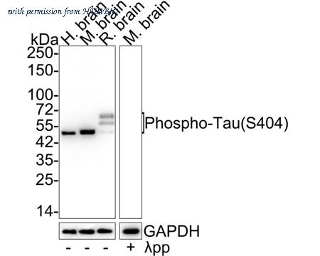 Western blot analysis of Phospho-Tau (S404) on different lysates with Rabbit anti-Phospho-Tau (S404) antibody (HA721801) at 1/1,000 dilution. Lane 1: Human brain tissue lysate Lane 2: Mouse brain tissue lysate Lane 3: Rat brain tissue lysate Lane 4: Mouse brain tissue lysate, the membrane treated with λpp for 1 hour Lysates/proteins at 30 µg/Lane. Predicted band size: 79 kDa Observed band size: 50-70 kDa Exposure time: 1 minute; 4-20% SDS-PAGE gel. Proteins were transferred to a PVDF membrane and blocked with 5% NFDM/TBST for 1 hour at room temperature. The primary antibody (HA721801) at 1/1,000 dilution was used in 5% NFDM/TBST at 4℃ overnight. Goat Anti-Rabbit IgG - HRP Secondary Antibody (HA1001) at 1/50,000 dilution was used for 1 hour at room temperature.
