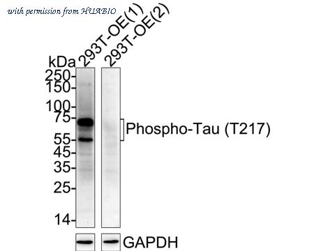 Western blot analysis of Phospho-Tau (T217) on different lysates with Rabbit anti-Phospho-Tau (T217) antibody (HA751287) at 1/2,000 dilution. Lane 1: 293T transfected with Tau cell lysate Lane 2: 293T transfected with Tau (mutated T217A) cell lysate (negative) Lysates/proteins at 15 µg/Lane. Predicted band size: 79 kDa Observed band size: 55-75 kDa Exposure time: 2 seconds; ECL: K1801; 4-20% SDS-PAGE gel. Proteins were transferred to a PVDF membrane and blocked with 5% NFDM/TBST for 1 hour at room temperature. The primary antibody (HA751287) at 1/2,000 dilution was used in 5% NFDM/TBST at 4℃ overnight. Goat Anti-Rabbit IgG - HRP Secondary Antibody (HA1001) at 1/50,000 dilution was used for 1 hour at room temperature.