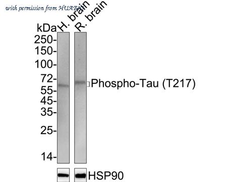 Western blot analysis of Phospho-Tau (T217) on different lysates with Rabbit anti-Phospho-Tau (T217) antibody (HA751287) at 1/1,000 dilution. Lane 1: Human brain tissue lysate (40 µg/Lane) Lane 2: Rat brain tissue lysate (40 µg/Lane) Predicted band size: 79 kDa Observed band size: 55-75 kDa Exposure time: 3 minutes; ECL: K1802; 4-20% SDS-PAGE gel. Proteins were transferred to a PVDF membrane and blocked with 5% NFDM/TBST for 1 hour at room temperature. The primary antibody (HA751287) at 1/1,000 dilution was used in 5% NFDM/TBST at 4℃ overnight. Goat Anti-Rabbit IgG - HRP Secondary Antibody (HA1001) at 1/50,000 dilution was used for 1 hour at room temperature.
