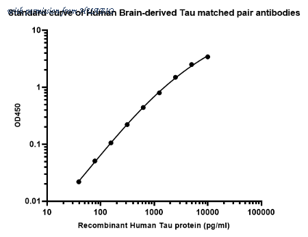 Sandwich ELISA analysis of Human Brain-derived tau/BD-tau matched pair antibodies Capture: HA723847, Brain-derived tau/BD-tau Rabbit mAb [PSH16-46] Detector: HA723209, Brain-derived tau/BD-tau Rabbit mAb [PSH10-42] Elisa assay was performed by coating wells of a 96-well plate with 100 µl per well of capture antibody (HA723847) diluted in carbonate/bicarbonate buffer, at a concentration of 5ug/ml overnight at 4℃. Wells of the plate were washed, blocked with 150 µl 0.05% tween-20 1% BSA blocking buffer, and incubated with serial diluted Recombinant Brain-derived tau/BD-tau protein (HA210937) starting from 10000 pg/ml to 0 pg/ml and detect antibody (HA723209, Biotin, 0.2 µg/ml) for 1 hour at 30℃ with shaking. Then the plate was washed and incubated with 100 µl per well of SA-HRP for 0.5 hour at 30℃ with shaking. Detection was performed using an Ultra TMB Substrate for 10 minutes at room temperature in the dark. The reaction was stopped with sulfuric acid and absorbances were read on a spectrophotometer at 450 nm.