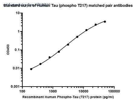 Sandwich ELISA analysis of Human Tau (phospho T217) matched pair antibodies Capture: HA723922, Phospho-Tau (T217) Rabbit mAb [PSH17-41] Detector: HA723209, Phospho-Tau (T217) Rabbit mAb [PSH10-42] Elisa assay was performed by coating wells of a 96-well plate with 100 µl per well of capture antibody (HA723922) diluted in carbonate/bicarbonate buffer, at a concentration of 5ug/ml overnight at 4℃. Wells of the plate were washed, blocked with 150 µl 0.05% tween-20 1% BSA blocking buffer, and incubated with serial diluted Recombinant Human Phospho-Tau (T217) protein (HA211033) starting from 50,000 pg/ml to 0 pg/ml and detect antibody (HA723209, Biotin, 0.2 µg/ml) for 1 hour at 30℃ with shaking. Then the plate was washed and incubated with 100 µl per well of SA-HRP for 0.5 hour at 30℃ with shaking. Detection was performed using an Ultra TMB Substrate for 10 minutes at room temperature in the dark. The reaction was stopped with sulfuric acid and absorbances were read on a spectrophotometer at 450 nm.
