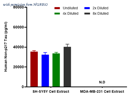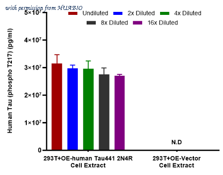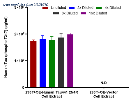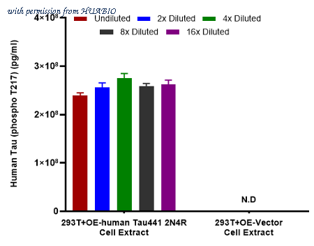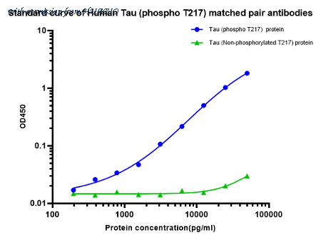 Coating Ab: HA723842, 5ug/mL Co-Incubation: 1:2 serially diluted human Tau (phospho T217) and Tau (Non-phospho T217) protein from HuaBio starting from a concentration of 50000 pg/ml and Detect Ab: (HA723209, biotin, 0.2 ug/ml) (30℃, 120 rpm, 60min). SA-HRP:1:20000(50ng/ml) (30°c, 120rpm, 30min).