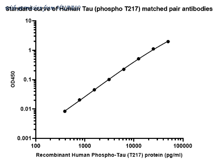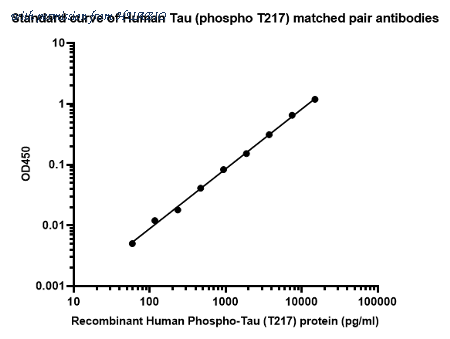 Sandwich ELISA analysis of Human Tau (phospho T217) matched pair antibodies Capture: HA723877, Phospho-Tau (T217) Rabbit mAb [PSH16-75] Detector: HA723209, Phospho-Tau (T217) Rabbit mAb [PSH10-42] Elisa assay was performed by coating wells of a 96-well plate with 100 µl per well of capture antibody (HA723877) diluted in carbonate/bicarbonate buffer, at a concentration of 5ug/ml overnight at 4℃. Wells of the plate were washed, blocked with 150 µl 0.05% tween-20 1%BSA blocking buffer, and incubated with serial diluted Recombinant Human Phospho-Tau (T217) protein (HA211033) starting from 15000 pg/ml to 0 pg/ml and detect antibody (HA723209, Biotin, 0.2 µg/ml) for 1 hour at 30℃ with shaking. Then the plate was washed and incubated with 100 µl per well of SA-HRP for 0.5 hour at 30℃ with shaking. Detection was performed using an Ultra TMB Substrate for 10 minutes at room temperature in the dark. The reaction was stopped with sulfuric acid and absorbances were read on a spectrophotometer at 450 nm.