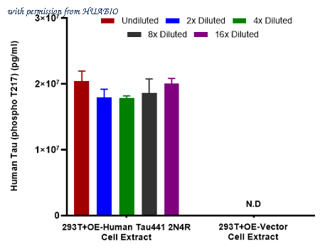 Interpolated concentrations of Tau (phospho T217) in 293T+Human Tau441 2N4R and 293T+OE-Vector Cell Extract samples based on a 1000 µg/ml extract load. 293T+Human Tau441 2N4R represented the overexpression of Tau (phospho T217) protein. 293T+OE-Vector represented the non-expression of Tau (phospho T217) protein. Capture: HA723841, Phospho-Tau (T217) Rabbit mAb [PSH16-41] Detector: HA723209, Phospho-Tau (T217) Rabbit mAb [PSH10-42] Interpolated concentration of Tau (phospho T217) was measured in duplicate at different sample concentrations and interpolated from the Tau (phospho T217) standard curves. The interpolated dilution factor corrected values were plotted (mean +/- SD, n=2). The mean Tau (phospho T217) concentration was determined to be 18 ug/mL in 293T+Human Tau441 2N4R cell extract. There was no detectable signal in 293T+OE-Vector cell extract.