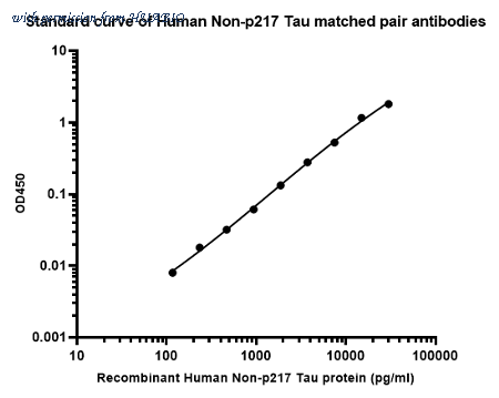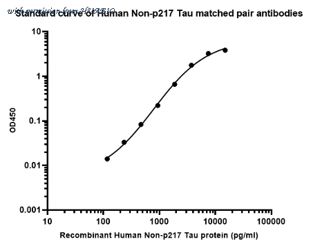 Sandwich ELISA analysis of Human Non-p217 Tau matched pair antibodies Capture: HA723844, Non-Phospho-Tau (T217) Rabbit mAb [PSH16-44] Detector: HA723209, Non-Phospho-Tau (T217) Rabbit mAb [PSH10-42] Elisa assay was performed by coating wells of a 96-well plate with 100 µl per well of capture antibody (HA723844) diluted in carbonate/bicarbonate buffer, at a concentration of 5ug/ml overnight at 4℃. Wells of the plate were washed, blocked with 150 µl 0.05% tween-20 1% BSA blocking buffer, and incubated with serial diluted Recombinant Human Phospho-Tau (T217) protein (HA210937) starting from 30000 pg/ml to 0 pg/ml and detect antibody (HA723209, Biotin, 0.2 µg/ml) for 1 hour at 30℃ with shaking. Then the plate was washed and incubated with 100 µl per well of SA-HRP for 0.5 hour at 30℃ with shaking. Detection was performed using an Ultra TMB Substrate for 10 minutes at room temperature in the dark. The reaction was stopped with sulfuric acid and absorbances were read on a spectrophotometer at 450 nm.