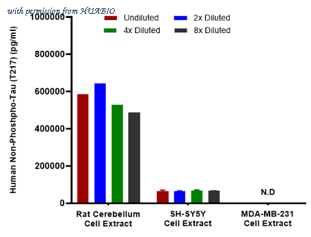 Interpolated concentrations of native Non-p217 Tau in rat cerebellum, SH-SY5Y and MDA-MB-231 extract samples based on a 1000 µg/ml extract load. Capture: HA723843, Non-Phospho-Tau (T217) Rabbit mAb [PSH16-43] Detector: HA723209, Non-Phospho-Tau (T217) Rabbit mAb [PSH10-42] Interpolated concentration of native Non-p217 Tau was measured in duplicate at different sample concentrations and interpolated from the Non-p217 Tau standard curves. The interpolated dilution factor corrected values were plotted (mean +/- SD, n=2). The mean Non-p217 Tau concentration was determined to be 561,264 pg/mL in rat cerebellum and 66,440 pg/mL in SH-SY5Y cell extract, There was no detectable signal in MDA-MB-231 cell extract.