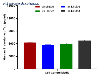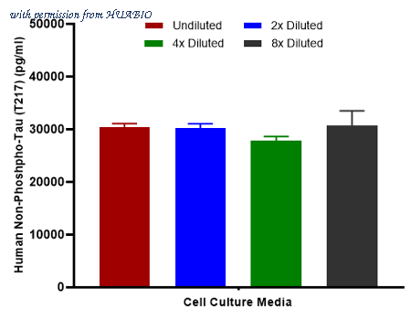 Interpolated concentrations of spiked Non-p217 Tau in cell culture media samples. Capture: HA723844, Phospho-Tau (T217) Rabbit mAb [PSH16-44] Detector: HA723209, Phospho-Tau (T217) Rabbit mAb [PSH10-42] The concentrations of Non-p217 Tau were measured in duplicates, interpolated from the Non-p217 Tau standard curves and corrected for sample dilution. Diluted samples are as follows: 50% cell culture media with FBS. The interpolated dilution factor corrected values are plotted (mean +/- SD, n=2).