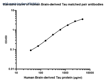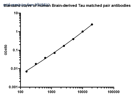 Sandwich ELISA analysis of Human Brain-derived tau/BD-tau matched pair antibodies Capture: HA723847, Brain-derived tau/BD-tau Rabbit mAb [PSH16-46] Detector: HA723848, Brain-derived tau/BD-tau Rabbit mAb [PSH10-47] Elisa assay was performed by coating wells of a 96-well plate with 100 µl per well of capture antibody (HA723847) diluted in carbonate/bicarbonate buffer, at a concentration of 5ug/ml overnight at 4℃. Wells of the plate were washed, blocked with 150 µl 0.05% tween-20 1% BSA blocking buffer, and incubated with serial diluted Recombinant Brain-derived tau/BD-tau protein (HA210937) starting from 10000 pg/ml to 0 pg/ml and detect antibody (HA723848, Biotin, 0.2 µg/ml) for 1 hour at 30℃ with shaking. Then the plate was washed and incubated with 100 µl per well of SA-HRP for 0.5 hour at 30℃ with shaking. Detection was performed using an Ultra TMB Substrate for 10 minutes at room temperature in the dark. The reaction was stopped with sulfuric acid and absorbances were read on a spectrophotometer at 450 nm.