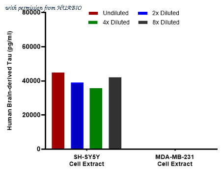 Interpolated concentrations of native Brain-derived Tau in SH-SY5Y and MDA-MB-231 cell extract samples based on a 1000 µg/ml extract load. Capture: HA723847, Brain-derived tau/BD-tau Rabbit mAb [PSH16-46] Detector: HA723848, Brain-derived tau/BD-tau Rabbit mAb [PSH10-47] Interpolated concentration of native Brain-derived Tau was measured in duplicate at different sample concentrations and interpolated from the Brain-derived Tau standard curves. The mean Brain-derived Tau concentration was determined to be 40,370 pg/mL in SH-SY5Y cell extract. There was no detectable signal in MDA-MB-231 cell extract.
