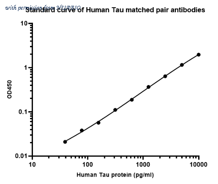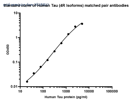 Sandwich ELISA analysis of human Tau matched pair antibodies Capture: HA723850, Tau Rabbit mAb [PSH16-48] Detector: HA723209, Tau Rabbit mAb [PSH10-42] Elisa assay was performed by coating wells of a 96-well plate with 100 µl per well of capture antibody (HA723850) diluted in carbonate/bicarbonate buffer, at a concentration of 5ug/ml overnight at 4℃. Wells of the plate were washed, blocked with 150 µl 0.05% tween-20 1% BSA blocking buffer, and incubated with serial diluted Recombinant Human Tau protein (HA211246) starting from 10000 pg/ml to 0 pg/ml and detect antibody (HA723209, Biotin, 0.2 µg/ml) for 1 hour at 30℃ with shaking. Then the plate was washed and incubated with 100 µl per well of SA-HRP for 0.5 hour at 30℃ with shaking. Detection was performed using an Ultra TMB Substrate for 10 minutes at room temperature in the dark. The reaction was stopped with sulfuric acid and absorbances were read on a spectrophotometer at 450 nm.