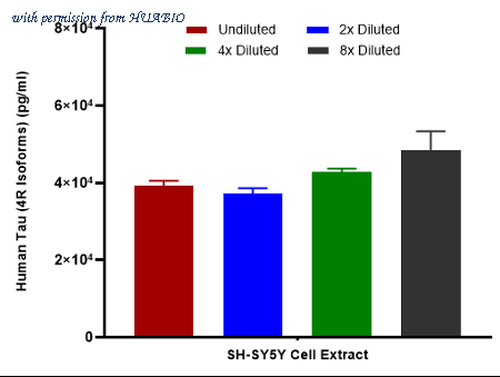 Interpolated concentrations of native Tau (4R Isoforms) in SH-SY5Y extract samples based on a 1000 µg/ml extract load. Capture: HA723850, Tau Rabbit mAb [PSH16-48] Detector: HA723851, Tau Rabbit mAb [PSH16-49] Interpolated concentration of native Tau (4R Isoforms) was measured in duplicate at different sample concentrations and interpolated from the Tau (4R Isoforms) standard curves. The interpolated dilution factor corrected values were plotted (mean +/- SD, n=2). The mean Tau (4R Isoforms) concentration was determined to be 41,927 pg/mL in SH-SY5Y cell extract.