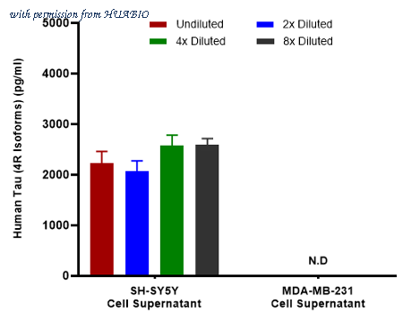 Interpolated concentrations of native Tau (4R Isoforms) in human cell culture supernatant samples. Capture: HA723850, Tau Rabbit mAb [PSH16-48] Detector: HA723851, Tau Rabbit mAb [PSH16-49] Interpolated concentration of native Tau (4R Isoforms) was measured in duplicate at different sample concentrations. The interpolated dilution factor corrected values were plotted (mean +/- SD, n=2). The mean Tau (4R Isoforms) concentration was determined to be 2,372 pg/mL in SH-SY5Y cell supernatant. There was no detectable signal in MDA-MB-231 cell culture supernatant.