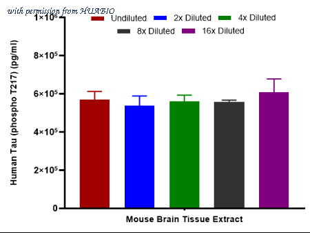 Interpolated concentrations of Tau (phospho T217) in mouse brain tissue extract samples based on a 1,000 µg/ml extract load. Capture: HA723922, Phospho-Tau (T217) Rabbit mAb [PSH17-41] Detector: HA723209, Phospho-Tau (T217) Rabbit mAb [PSH10-42] Interpolated concentration of Tau (phospho T217) was measured in duplicate at different sample concentrations and interpolated from the Tau (phospho T217) standard curves. The mean Tau (phospho T217) concentration was determined to be 567,31 pg/mL in mouse brain tissue extract.