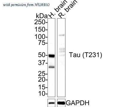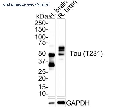 Western blot analysis of Phospho-Tau (T231) on different lysates with Rabbit anti-Phospho-Tau (T231) antibody (HA721569) at 1/1,000 dilution. Lane 1: Human brain tissue lysate Lane 2: Rat brain tissue lysate Lysates/proteins at 50 µg/Lane. Predicted band size: 46 kDa Observed band size: 35-70 kDa Exposure time: 2 minutes; 4-20% SDS-PAGE gel. Proteins were transferred to a PVDF membrane and blocked with 5% NFDM/TBST for 1 hour at room temperature. The primary antibody (HA721569) at 1/1,000 dilution was used in 5% NFDM/TBST at room temperature for 2 hours. Goat Anti-Rabbit IgG - HRP Secondary Antibody (HA1001) at 1:100,000 dilution was used for 1 hour at room temperature.