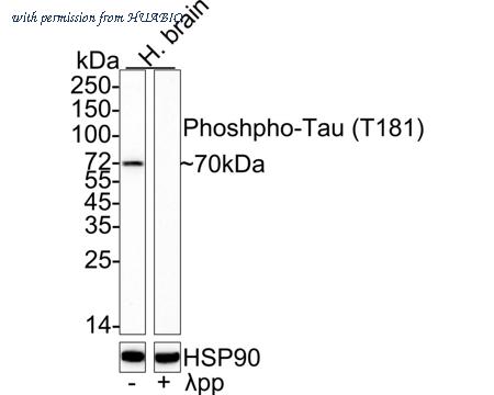 Western blot analysis of Phospho-Tau (T181) on different lysates with Rabbit anti-Phospho-Tau (T181) antibody (HA722271) at 1/1,000 dilution. Lane 1: Human brain tissue lysate Lane 2: Human brain tissue lysate, the membrane treated with λpp for 1 hour Lysates/proteins at 40 µg/Lane. Predicted band size: 79 kDa Observed band size: 70 kDa Exposure time: 3 minutes; ECL: K1801; 4-20% SDS-PAGE gel. Proteins were transferred to a PVDF membrane and blocked with 5% NFDM/TBST for 1 hour at room temperature. The primary antibody (HA722271) at 1/1,000 dilution was used in 5% NFDM/TBST at room temperature for 2 hours. Goat Anti-Rabbit IgG - HRP Secondary Antibody (HA1001) at 1/50,000 dilution was used for 1 hour at room temperature.