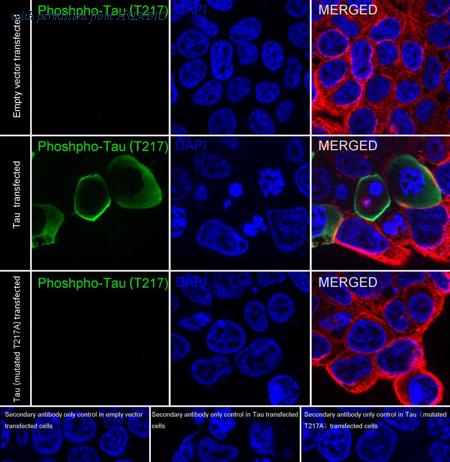 Immunocytochemistry analysis of 293T cells labeling Phospho-Tau (T217) with Rabbit anti-Phospho-Tau (T217) antibody (HA751287) at 1/500 dilution. 293T cells, transfected with empty control (top, negative) / Tau (middle, positive) / Tau (mutated T217A) (bottom, negative) expression vector, respectively, were fixed in 4% paraformaldehyde for 15 minutes at room temperature, permeabilized with 0.1% Triton X-100 in PBS for 15 minutes at room temperature, then blocked with 1% BSA in 10% negative goat serum for 1 hour at room temperature. Cells were then incubated with Rabbit anti-Phospho-Tau (T217) antibody (HA751287) at 1/500 dilution in 1% BSA in PBST overnight at 4 ℃. Goat Anti-Rabbit IgG H&L (iFluor™ 488, HA1121) was used as the secondary antibody at 1/1,000 dilution. PBS instead of the primary antibody was used as the secondary antibody only control. Nuclear DNA was labelled in blue with DAPI. Beta tubulin (HA601187, red) was stained at 1/100 dilution overnight at +4℃. Goat Anti-Mouse IgG H&L (iFluor™ 594, HA1126) was used as the secondary antibody at 1/1,000 dilution.
