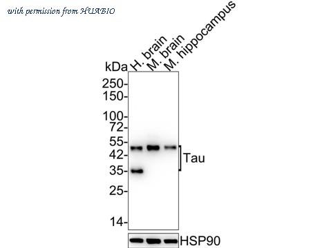 Western blot analysis of Tau on different lysates with Rabbit anti-Tau antibody (R1401-7) at 1/1,000 dilution. Lane 1: Human brain tissue lysate Lane 2: Mouse brain tissue lysate Lane 3: Mouse hippocampus tissue lysate Lysates/proteins at 20 µg/Lane. Predicted band size: 79 kDa Observed band size: 35-50 kDa Exposure time: 1 minute 55 seconds; 4-20% SDS-PAGE gel. Proteins were transferred to a PVDF membrane and blocked with 5% NFDM/TBST for 1 hour at room temperature. The primary antibody (R1401-7) at 1/1,000 dilution was used in 5% NFDM/TBST at 4℃ overnight. Goat Anti-Rabbit IgG - HRP Secondary Antibody (HA1001) at 1/50,000 dilution was used for 1 hour at room temperature.