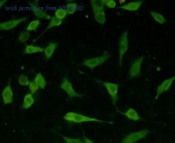 ICC staining of Phospho-Tau (S396) in N2A cells (green). Formalin fixed cells were permeabilized with 0.1% Triton X-100 in TBS for 10 minutes at room temperature and blocked with 1% Blocker BSA for 15 minutes at room temperature. Cells were probed with the primary antibody (HA750268, 1/50) for 1 hour at room temperature, washed with PBS. Alexa Fluor®488 Goat anti-Rabbit IgG was used as the secondary antibody at 1/1,000 dilution. The nuclear counter stain is DAPI (blue).