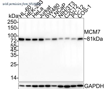 Western blot analysis of MCM7 on different lysates with Mouse anti-MCM7 antibody (EM1901-12) at 1/1,000 dilution. Lane 1: HL-60 cell lysate Lane 2: HEK-293 cell lysate Lane 3: HeLa cell lysate Lane 4: Jurkat cell lysate Lane 5: SW480 cell lysate Lane 6: LNCaP cell lysate Lane 7: NIH/3T3 cell lysate Lane 8: C2C12 cell lysate Lane 9: PC-12 cell lysate Lane 10: COS-1 cell lysate Lysates/proteins at 20 µg/Lane. Predicted band size: 81 kDa Observed band size: 81 kDa Exposure time: 51 seconds; 4-20% SDS-PAGE gel. Proteins were transferred to a PVDF membrane and blocked with 5% NFDM/TBST for 1 hour at room temperature. The primary antibody (EM1901-12) at 1/1,000 dilution was used in 5% NFDM/TBST at 4℃ overnight. Goat Anti-Mouse IgG - HRP Secondary Antibody (HA1006) at 1/50,000 dilution was used for 1 hour at room temperature.