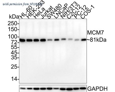 Western blot analysis of MCM7 on different lysates with Mouse anti-MCM7 antibody (HA601288) at 1/1,000 dilution. Lane 1: HL-60 cell lysate Lane 2: HEK-293 cell lysate Lane 3: HeLa cell lysate Lane 4: Jurkat cell lysate Lane 5: SW480 cell lysate Lane 6: LNCaP cell lysate Lane 7: NIH/3T3 cell lysate Lane 8: C2C12 cell lysate Lane 9: PC-12 cell lysate Lane 10: COS-1 cell lysate Lysates/proteins at 20 µg/Lane. Predicted band size: 81 kDa Observed band size: 81 kDa Exposure time: 1 minute 55 seconds; 4-20% SDS-PAGE gel. Proteins were transferred to a PVDF membrane and blocked with 5% NFDM/TBST for 1 hour at room temperature. The primary antibody (HA601288) at 1/1,000 dilution was used in 5% NFDM/TBST at 4℃ overnight. Goat Anti-Mouse IgG - HRP Secondary Antibody (HA1006) at 1/50,000 dilution was used for 1 hour at room temperature.