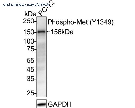 Western blot analysis of Phospho-Met (Y1349) on PC-12 cell lysates with Rabbit anti-Phospho-Met (Y1349) antibody (ET7110-14) at 1/2,000 dilution. Lysates/proteins at 20 µg/Lane. Predicted band size: 156 kDa Observed band size: 156 kDa Exposure time: 25 seconds; ECL: K1802; 4-20% SDS-PAGE gel. Proteins were transferred to a PVDF membrane and blocked with 5% NFDM/TBST for 1 hour at room temperature. The primary antibody (ET7110-14) at 1/2,000 dilution was used in 5% NFDM/TBST at 4℃ overnight. Goat Anti-Rabbit IgG - HRP Secondary Antibody (HA1001) at 1/50,000 dilution was used for 1 hour at room temperature.