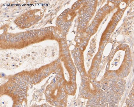 Immunohistochemical analysis of paraffin-embedded human colon carcinoma tissue using anti-Phospho-Met (Y1349) antibody. The section was pre-treated using heat mediated antigen retrieval with Tris-EDTA buffer (pH 8.0-8.4) for 20 minutes.The tissues were blocked in 5% BSA for 30 minutes at room temperature, washed with ddH2O and PBS, and then probed with the primary antibody (ET7110-14, 1/50) for 30 minutes at room temperature. The detection was performed using an HRP conjugated compact polymer system. DAB was used as the chromogen. Tissues were counterstained with hematoxylin and mounted with DPX.