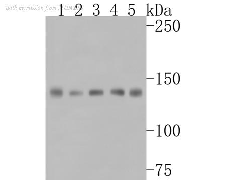 Western blot analysis of Met (c-Met) on different lysates. Proteins were transferred to a PVDF membrane and blocked with 5% BSA in PBS for 1 hour at room temperature. The primary antibody (HA500242, 1/500) was used in 5% BSA at room temperature for 2 hours. Goat Anti-Rabbit IgG - HRP Secondary Antibody (HA1001) at 1:200,000 dilution was used for 1 hour at room temperature. Positive control: Lane 1: LO2 cell lysate Lane 2: Hela cell lysate Lane 3: A549 cell lysate Lane 4: A431 cell lysate Lane 5: HT-29 cell lysate