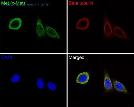Immunocytochemistry analysis of SiHa cells labeling Met (c-Met) with Rabbit anti-Met (c-Met) antibody (HA500242) at 1/200 dilution. Cells were fixed in 4% paraformaldehyde for 10 minutes at 37 ℃, permeabilized with 0.05% Triton X-100 in PBS for 20 minutes, and then blocked with 2% negative goat serum for 30 minutes at room temperature. Cells were then incubated with Rabbit anti-Met (c-Met) antibody (HA500242) at 1/200 dilution in 2% negative goat serum overnight at 4 ℃. Goat Anti-Rabbit IgG H&L (Alexa Fluor® 488) was used as the secondary antibody at 1/1,000 dilution. Nuclear DNA was labelled in blue with DAPI. Beta tubulin (M1305-2, red) was stained at 1/200 dilution overnight at +4℃. Goat Anti-Mouse IgG H&L (Alexa Fluor® 647) were used as the secondary antibody at 1/1,000 dilution.