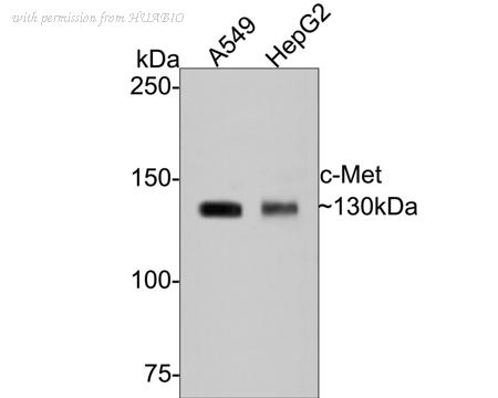 Western blot analysis of c-Met on different lysates with Mouse anti-c-Met antibody (HA601093) at 1/500 dilution. Lane 1: A549 cell lysate Lane 2: HepG2 cell lysate Lysates/proteins at 10 µg/Lane. Predicted band size: 156 kDa Observed band size: 130 kDa Exposure time: 2 minutes; 6% SDS-PAGE gel. Proteins were transferred to a PVDF membrane and blocked with 5% NFDM/TBST for 1 hour at room temperature. The primary antibody (HA601093) at 1/500 dilution was used in 5% NFDM/TBST at room temperature for 2 hours. Goat Anti-Mouse IgG - HRP Secondary Antibody (HA1006) at 1:150,000 dilution was used for 1 hour at room temperature.