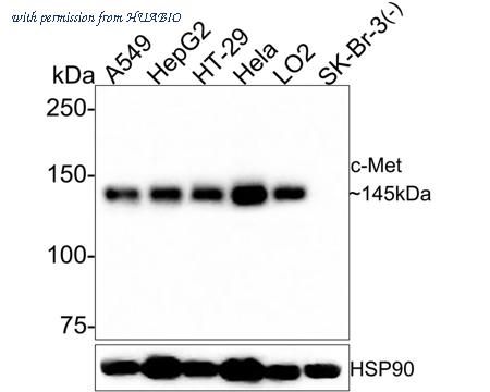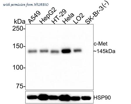Western blot analysis of c-Met on different lysates with Rabbit anti-c-Met antibody (HA750594) at 1/1,000 dilution. Lane 1: A549 cell lysate Lane 2: HepG2 cell lysate Lane 3: HT-29 cell lysate Lane 4: Hela cell lysate Lane 5: LO2 cell lysate Lane 6: SK-Br-3 cell lysate (Negative) Lysates/proteins at 30 µg/Lane. Predicted band size: 156 kDa Observed band size: 145 kDa Exposure time: 1 minute; 6% SDS-PAGE gel. Proteins were transferred to a PVDF membrane and blocked with 5% NFDM/TBST for 1 hour at room temperature. The primary antibody (HA750594) at 1/1,000 dilution was used in 5% NFDM/TBST at room temperature for 2 hours. Goat Anti-Rabbit IgG - HRP Secondary Antibody (HA1001) at 1:300,000 dilution was used for 1 hour at room temperature.