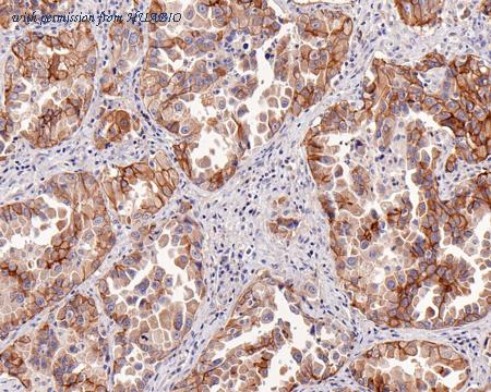 Immunohistochemical analysis of paraffin-embedded human lung carcinoma tissue with Mouse anti-c-Met antibody (HA601092) at 1/400 dilution. The section was pre-treated using heat mediated antigen retrieval with Tris-EDTA buffer (pH 9.0) for 20 minutes. The tissues were blocked in 1% BSA for 20 minutes at room temperature, washed with ddH2O and PBS, and then probed with the primary antibody (HA601092) at 1/400 dilution for 1 hour at room temperature. The detection was performed using an HRP conjugated compact polymer system. DAB was used as the chromogen. Tissues were counterstained with hematoxylin and mounted with DPX.