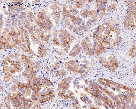 Immunohistochemical analysis of paraffin-embedded human lung carcinoma tissue with Mouse anti-c-Met antibody (HA601093) at 1/400 dilution. The section was pre-treated using heat mediated antigen retrieval with Tris-EDTA buffer (pH 9.0) for 20 minutes. The tissues were blocked in 1% BSA for 20 minutes at room temperature, washed with ddH2O and PBS, and then probed with the primary antibody (HA601093) at 1/400 dilution for 1 hour at room temperature. The detection was performed using an HRP conjugated compact polymer system. DAB was used as the chromogen. Tissues were counterstained with hematoxylin and mounted with DPX.