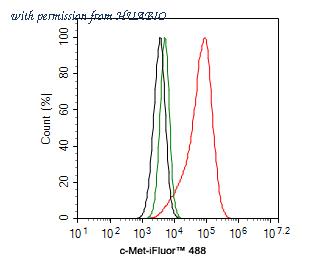 Flow cytometric analysis of Hela cells labeling c-Met. Cells were fixed and permeabilized. Then stained with the primary antibody (HA721287, 1ug/ml) (red) compared with Rabbit IgG Isotype Control (green). After incubation of the primary antibody at +4℃ for an hour, the cells were stained with a iFluor™ 488 conjugate-Goat anti-Rabbit IgG Secondary antibody (HA1121) at 1/1,000 dilution for 30 minutes at +4℃. Unlabelled sample was used as a control (cells without incubation with primary antibody; black).