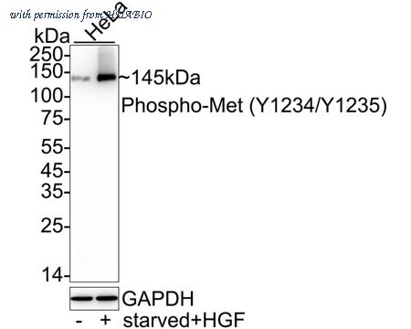 Western blot analysis of Phospho-Met (Y1234/Y1235) on different lysates with Rabbit anti-Phospho-Met (Y1234/Y1235) antibody (HA722765) at 1/1,000 dilution. Lane 1: HeLa cell lysate Lane 2: HeLa starved for 16 hours then treated with 20ng/mL HGF for 10 minutes cell lysate Lysates/proteins at 20 µg/Lane. Predicted band size: 156 kDa Observed band size: 145 kDa Exposure time: 59 seconds; ECL: K1801; 4-20% SDS-PAGE gel. Proteins were transferred to a PVDF membrane and blocked with 5% NFDM/TBST for 1 hour at room temperature. The primary antibody (HA722765) at 1/1,000 dilution was used in 5% NFDM/TBST at 4℃ overnight. Goat Anti-Rabbit IgG - HRP Secondary Antibody (HA1001) at 1/50,000 dilution was used for 1 hour at room temperature.