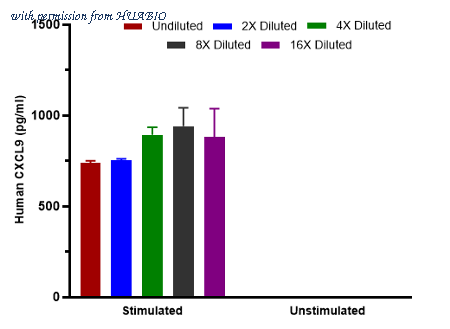 Interpolated concentrations of native CXCL9 in THP-1 cell culture supernatant. Capture: HA725004, Human CXCL9 Rabbit mAb [PSH12-34] Detector: HA725005, Human CXCL9 Rabbit mAb [PSH12-35] THP-1 cells were stimulated with 200 ng/ml IFN-γ and 50ng/ml LPS or vehicle control and incubated for 24 hours. The concentrations of CXCL9 measured in duplicate and interpolated from the CXCL9 standard curve and corrected for sample dilution. Undiluted samples are as follows: unstimulated 100% and stimulated 100%. The interpolated dilution factor corrected values are plotted (mean +/- SD, n=2). The mean CXCL9 concentration was determined to be 841.6 pg/ml in IFN-γ and LPS stimulated THP-1 cell culture supernatant and undetectable in the unstimulated THP-1 control.