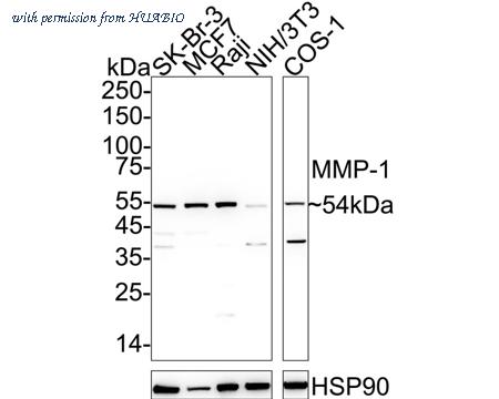 Western blot analysis of MMP-1 on different lysates with Rabbit anti-MMP-1 antibody (ER31211) at 1/1,000 dilution. Lane 1: SK-Br-3 cell lysate Lane 2: MCF7 cell lysate Lane 3: Raji cell lysate Lane 4: NIH/3T3 cell lysate Lane 5: COS-1 cell lysate Lysates/proteins at 15 µg/Lane. Predicted band size: 54 kDa Observed band size: 54 kDa Exposure time: 23 seconds; ECL: K1801; 4-20% SDS-PAGE gel. Proteins were transferred to a PVDF membrane and blocked with 5% NFDM/TBST for 1 hour at room temperature. The primary antibody (ER31211) at 1/1,000 dilution was used in 5% NFDM/TBST at 4℃ overnight. Goat Anti-Rabbit IgG - HRP Secondary Antibody (HA1001) at 1/50,000 dilution was used for 1 hour at room temperature.