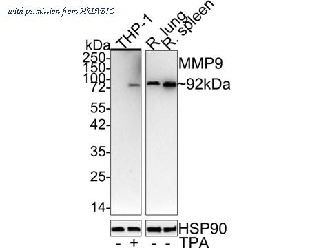 Western blot analysis of MMP-9 on different lysates with Rabbit anti-MMP-9 antibody (HA750420) at 1/5,000 dilution. Lane 1: THP-1 whole cell lysate (20 µg/Lane) Lane 2: THP-1 treated with 200nM TPA for 10 minutes whole cell lysate (20 µg/Lane) Lane 3: Rat lung tissue lysate (20 µg/Lane) Lane 4: Rat spleen tissue lysate (20 µg/Lane) Predicted band size: 78 kDa Observed band size: 92 kDa Exposure time: 2 minutes; 4-20% SDS-PAGE gel. Proteins were transferred to a PVDF membrane and blocked with 5% NFDM/TBST for 1 hour at room temperature. The primary antibody (HA750420) at 1/5,000 dilution was used in 5% NFDM/TBST at room temperature for 2 hours. Goat Anti-Rabbit IgG - HRP Secondary Antibody (HA1001) at 1:100,000 dilution was used for 1 hour at room temperature.