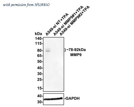 Western blot analysis of MMP9 on different lysates with Rabbit anti-MMP9 antibody (HA750420) at 1/5,000 dilution. Lane 1: A549-si NT+TPA(80nM 24h) cell lysate, 15 µg/Lane Lane 2: A549-si MMP9#1+TPA(80nM 24h) cell lysate, 15 µg/Lane Lane 3: A549-si MMP9#2+TPA(80nM 24h) cell lysate, 15 µg/Lane Predicted band size: 78 kDa Observed band size: 78-92 kDa Exposure time: 1 minute 40 seconds; 4-20% SDS-PAGE gel. Proteins were transferred to a PVDF membrane and blocked with 5% NFDM in TBST for 1 hour at room temperature. The primary antibody (ET1704-69, 1/5,000) and Loading control antibody (Rabbit anti-GAPDH, ET1601-4, 1/10,000) were used in 5% BSA at room temperature for 2 hours. Goat Anti-rabbit IgG-HRP Secondary Antibody (HA1001) at 1/100,000 dilution was used for 1 hour at room temperature.
