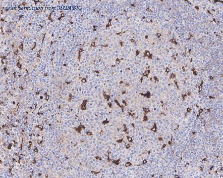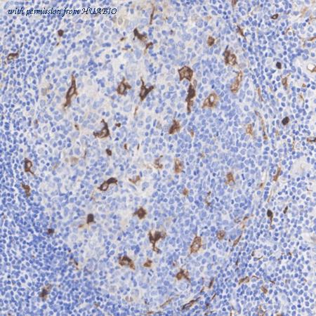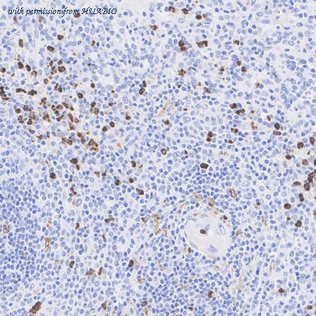 Immunohistochemical analysis of paraffin-embedded human spleen tissue with Rabbit anti-MMP-9 antibody (HA751070) at 1/1,000 dilution. The section was pre-treated using heat mediated antigen retrieval with Tris-EDTA buffer (pH 9.0) for 20 minutes. The tissues were blocked in 1% BSA for 20 minutes at room temperature, washed with ddH2O and PBS, and then probed with the primary antibody (HA751070) at 1/1,000 dilution for 1 hour at room temperature. The detection was performed using an HRP conjugated compact polymer system. DAB was used as the chromogen. Tissues were counterstained with hematoxylin and mounted with DPX.