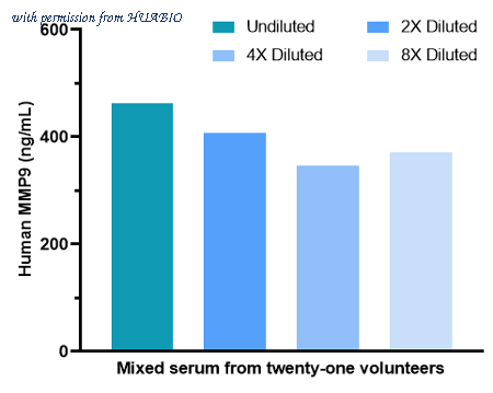 The concentrations of MMP9 were interpolated from the MMP9 standard curves and corrected for sample dilution. Undiluted samples are mixed serum from twenty-one volunteers 0.5%. The mean MMP9 concentration was determined to be 397.2 ng/ml in mixed serum from twenty-one volunteers.