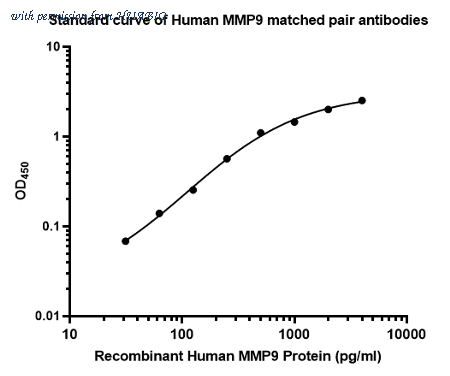 Sandwich ELISA analysis of Human MMP9 matched pair antibodies Elisa assay was performed by coating wells of a 96-well plate with 100 µl per well of capture antibody (HA722106) diluted in carbonate/bicarbonate buffer, at a concentration of 2 µg/ml overnight at 4℃. Wells of the plate were washed, blocked with 150 µl 0.05% tween-20 1% BSA blocking buffer, and incubated with serial diluted Recombinant Human MMP9 protein (HA210698) starting from 4000 pg/ml to 0 pg/ml and detect antibody (HA722107) (Biotin-conjugated, 0.2 µg/ml) for 1 hour at 30℃ with shaking. Then the plate was washed and incubated with 100 µl per well of SA-HRP for 0.5 hour at 30℃ with shaking. Detection was performed using an Ultra TMB Substrate for 10 minutes at room temperature in the dark. The reaction was stopped with sulfuric acid and absorbances were read on a spectrophotometer at 450 nm.