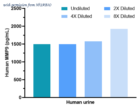 The concentrations of MMP9 were interpolated from the MMP9 standard curves and corrected for sample dilution. Undiluted samples are human urine 100%. The mean MMP9 concentration was determined to be 1624.2 pg/ml in human urine.