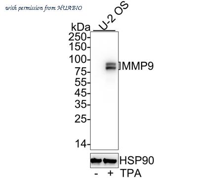 Western blot analysis of MMP-9 on different lysates with Rabbit anti-MMP-9 antibody (HA722665) at 1/2,000 dilution. Lane 1: U-2 OS cell lysate Lane 2: U-2 OS treated with 200nM TPA for 24 hours cell lysate Lysates/proteins at 20 µg/Lane. Predicted band size: 78 kDa Observed band size: 78/92 kDa Exposure time: 3 seconds; ECL: K1801; 4-20% SDS-PAGE gel. Proteins were transferred to a PVDF membrane and blocked with 5% NFDM/TBST for 1 hour at room temperature. The primary antibody (HA722665) at 1/2,000 dilution was used in 5% NFDM/TBST at 4℃ overnight. Goat Anti-Rabbit IgG - HRP Secondary Antibody (HA1001) at 1/50,000 dilution was used for 1 hour at room temperature.