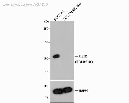 All lanes: Western blot analysis of MSH2 with anti-MSH2 antibody (ER1803-86) at 1:1,000 dilution. Lane 1: Wild-type SCC7 whole cell lysate. Lane 2: MSH2 knockout SCC7 whole cell lysate. ER1803-86 was shown to specifically react with MSH2 in wild-type SCC7 cells. No band was observed when MSH2 knockout samples were tested. Wild-type and MSH2 knockout samples were subjected to SDS-PAGE. Proteins were transferred to a PVDF membrane and blocked with 5% NFDM in TBST for 1 hour at room temperature. The primary Anti-MSH2 antibody (ER1803-86, 1/1,000) and Anti-HSP90 antibody (ET1605-56, 1/10,000) were used in 5% BSA at room temperature for 2 hours. Goat Anti-Rabbit IgG H&L (HRP) Secondary Antibody (HA1001) at 1:200,000 dilution was used for 1 hour at room temperature.
