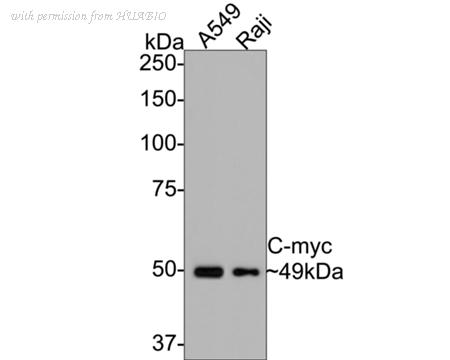Western blot analysis of c-Myc on different lysates with Rabbit anti-c-Myc antibody (0912-2) at 1/1,000 dilution. Lane 1: A549 cell lysate Lane 2: Raji cell lysate Lysates/proteins at 10 µg/Lane. Predicted band size: 49 kDa Observed band size: 49 kDa Exposure time: 2 minutes; 8% SDS-PAGE gel. Proteins were transferred to a PVDF membrane and blocked with 5% NFDM/TBST for 1 hour at room temperature. The primary antibody (0912-2) at 1/1,000 dilution was used in 5% NFDM/TBST at room temperature for 2 hours. Goat Anti-Rabbit IgG - HRP Secondary Antibody (HA1001) at 1:300,000 dilution was used for 1 hour at room temperature.