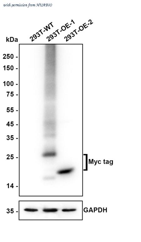 Western blot analysis of Myc tag on different lysates with Rabbit anti-Myc tag antibody (R1208-1) at 1/20,000 dilution. Lane 1: 293T cell lysate Lane 2: 293T transfected with Myc-tagged Claudin18.2 (C-terminal) cell lysate Lane 3: 293T transfected with Myc-tagged Histone H3.1 (N-terminal) cell lysate Lysates/proteins at 10 µg/Lane. Exposure time: 2 seconds; ECL: K1801; 4-20% SDS-PAGE gel. Proteins were transferred to a PVDF membrane and blocked with 5% NFDM/TBST for 1 hour at room temperature. The primary antibody (R1208-1) at 1/20,000 dilution was used in 5% NFDM/TBST at 4℃ overnight. Goat Anti-Rabbit IgG - HRP Secondary Antibody (HA1001) at 1/50,000 dilution was used for 1 hour at room temperature.