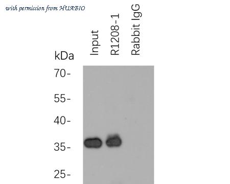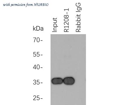 Myc tag was immunoprecipitated in 2µg C terminal Myc Tag fusion protein lysate with R1208-1 at 2 µg/20 µl agarose. Western blot was performed from the immunoprecipitate using EM31105 at 1/1000 dilution. Anti-Mouse IgG - HRP Secondary Antibody (HA1006) at 1:20,000 dilution was used for 60 mins at room temperature. Lane 1: Myc Tag fusion protein lysate (input). Lane 2: R1208-1 IP in Myc Tag fusion protein lysate. Lane 3: Rabbit IgG instead of R1208-1 in Myc Tag fusion protein lysate. Blocking/Dilution buffer: 5% NFDM/TBST