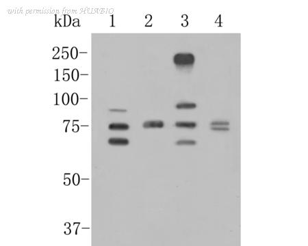 Western blot analysis of CEACAM6 on different lysates. Proteins were transferred to a PVDF membrane and blocked with 5% BSA in PBS for 1 hour at room temperature. The primary antibody (ER1902-54, 1/500) was used in 5% BSA at room temperature for 2 hours. Goat Anti-Rabbit IgG - HRP Secondary Antibody (HA1001) at 1:5,000 dilution was used for 1 hour at room temperature. Positive control: Lane 1: JAR cell lysate Lane 2: Rat lung tissue lysate Lane 3: MCF-7 cell lysate Lane 2: Human lung tissue lysate