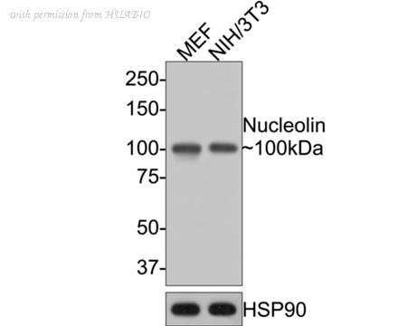 Western blot analysis of Nucleolin on different lysates with Rabbit anti-Nucleolin antibody (HA721073) at 1/500 dilution. Lane 1: MEF cell lysate Lane 2: NIH/3T3 cell lysate Lysates/proteins at 10 µg/Lane. Predicted band size: 77 kDa Observed band size: 100 kDa Exposure time: 30 seconds; 8% SDS-PAGE gel. Proteins were transferred to a PVDF membrane and blocked with 5% NFDM/TBST for 1 hour at room temperature. The primary antibody (HA721073) at 1/500 dilution was used in 5% NFDM/TBST at room temperature for 2 hours. Goat Anti-Rabbit IgG - HRP Secondary Antibody (HA1001) at 1:300,000 dilution was used for 1 hour at room temperature.