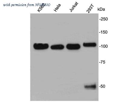 Western blot analysis of Nucleolin on different lysates with Rabbit anti-Nucleolin antibody (HA721073) at 1/5,000 dilution. Lane 1: K562 cell lysate Lane 2: Jurkat cell lysate Lane 3: Hela cell lysate Lane 4: A431 cell lysate Lysates/proteins at 10 µg/Lane. Predicted band size: 77 kDa Observed band size: 100 kDa Exposure time: 2 minutes; 6% SDS-PAGE gel. Proteins were transferred to a PVDF membrane and blocked with 5% NFDM/TBST for 1 hour at room temperature. The primary antibody (HA721073) at 1/5,000 dilution was used in 5% NFDM/TBST at room temperature for 2 hours. Goat Anti-Rabbit IgG - HRP Secondary Antibody (HA1001) at 1:300,000 dilution was used for 1 hour at room temperature.